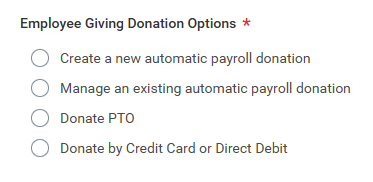 Workday Employee Giving Donation Options menu screenshot (shown for reference)